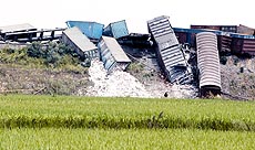 記者看到,脫軌的車廂共有19節(jié)。有兩節(jié)車廂完全橫在了鐵路中央,另幾節(jié)側(cè)翻在鐵路一側(cè),還有兩節(jié)沖下了鐵路路基,多處鐵軌呈彎曲狀,許多車廂的車輪已經(jīng)飛落到周圍的稻田里,路邊的幾根電線桿被連根拔起。列車上集裝箱內(nèi)的瓷磚、大理石等散落一地。據(jù)有關(guān)部門認定,脫軌車廂位于列車第27至45節(jié)。南昌鐵路局目前已組織人員在現(xiàn)場進行緊急救援。