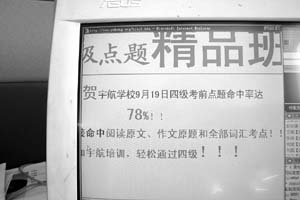 據(jù)《京華時報》報道,北京某高校剛剛參加完英語四級考試的小鮑反映,前天,不少同學在地質大學看到當晚在該校將舉行“四級考試考前點題培訓”的海報,入場券50元,舉辦方為北京宇航考試培訓學校。“這次培訓點中了試題中大概50分的內容!”