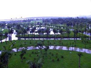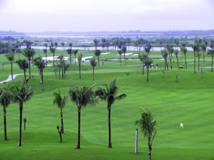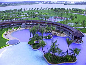 事實(shí)上,當(dāng)記者站在酒店總統(tǒng)套房的大露臺(tái)上,心曠神怡的感覺(jué)真是撲面而來(lái)。在這個(gè)露臺(tái)上俯瞰酒店的生態(tài)泳池,綠色的島嶼小品與棕色木質(zhì)燒烤回廊講述著回歸自然的故事;視野穿過(guò)起伏的高爾夫球場(chǎng),可以遠(yuǎn)眺南中國(guó)海的碧波。一條被河流沖積泥沙與外海海浪共同作用而成的沙堤——玉帶灘,蜿蜒三公里將萬(wàn)泉河、龍滾河、九曲江三江入?诜殖闪藘(nèi)外咸淡兩海,其中內(nèi)海之中形成若干個(gè)小島,在眼前演繹著豐富而多變的江、河、湖、海、島嶼、山脈的水域景觀。