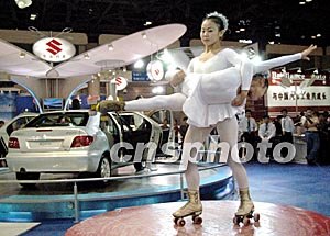 兩位雜技小演員九月二十五日在北京國(guó)際商用車展覽會(huì)中的湖北東風(fēng)雪鐵龍展臺(tái)上,展示圓桌輪滑高超技藝,為愛(ài)麗舍(Elysee)X與SX型新車促銷表演。作者:鄒憲