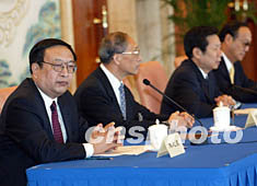國(guó)家發(fā)展改革委員會(huì)、商業(yè)部九月二十七日在北京與全國(guó)政協(xié)副主席霍英東任訪問(wèn)團(tuán)團(tuán)長(zhǎng)的香港工商界知名人士訪問(wèn)團(tuán)舉行座談會(huì),李嘉誠(chéng)、何鴻燊等出席座談會(huì)。中新社記者:滿會(huì)喬