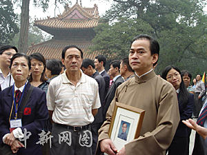 香港曉風(fēng)學(xué)社參禮團(tuán)的梁崇武先生,手捧父親梁子江先生的遺像參加了祭拜。原來,祖籍香港的梁子江先生,生前對孔子非常崇敬,并在香港創(chuàng)辦了以研究、弘揚(yáng)祖國書畫、篆刻藝術(shù)的“曉風(fēng)學(xué)社”,一直想著要到曲阜孔廟祭拜孔子。后來梁子江先生年齡大了行動不便,最終抱憾而去。今年,梁崇武先生與香港曉風(fēng)學(xué)社的成員邀請了梁子江先生的弟子與生前好友共六十多人前來祭孔。梁崇武先生在大成殿前高舉著父親的遺像說道:“父親,今天我為您實(shí)現(xiàn)了遺愿”。