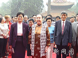 孔廟大成殿前懸掛著的“紀(jì)念孔子兩千五百五十四年誕辰”橫幅和“先師功德垂青史,儒學(xué)精華照五洲”的對聯(lián),表達(dá)出海峽兩岸孔子后裔及海內(nèi)外儒學(xué)信仰者的共同心愿。孔子第七十七代嫡孫孔德懋受在海峽彼岸臺灣的孔德成先生的委托,與家人一起來到大成殿前,祭拜祖先。眾多海內(nèi)外孔子后裔與來自印尼、韓國、馬來西亞、美國、香港、臺灣、澳門等十多個國家和地區(qū)的祭孔參禮團(tuán)的數(shù)百名來賓祭拜了“至圣先師”——孔子。