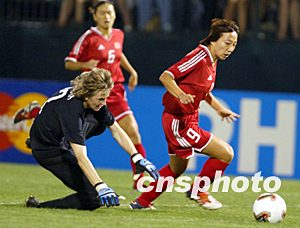 已在世界杯上打進(jìn)十一球的孫雯在第二十九分鐘時(shí)險(xiǎn)些平了美國人保持的世界杯個(gè)人進(jìn)球紀(jì)錄,她在對方禁區(qū)內(nèi)頭球沖頂,球打在立柱上彈出。
