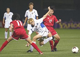 因?yàn)橥M的加納隊(duì)在先進(jìn)行的另外一場比賽中出人意料地以二比一戰(zhàn)勝善擺“鐵桶陣”的澳大利亞隊(duì),把中國隊(duì)提前送進(jìn)八強(qiáng),這無疑給中國隊(duì)員減輕了很大的心理壓力。必須取勝才能以小組第一的身份出線的中國隊(duì)一開場就對俄隊(duì)的陣地展開了猛攻,而俄隊(duì)并沒有像人們賽前預(yù)料的那樣收縮密集防守,而是與中國隊(duì)展開對攻。中國隊(duì)兇狠的中場搶截使俄隊(duì)難以組織起像樣的進(jìn)攻,而有了中場有力支持,中國隊(duì)鋒線上的兩把尖刀孫雯和白潔開始顯現(xiàn)應(yīng)有的威力,俄隊(duì)門前險(xiǎn)情不斷。