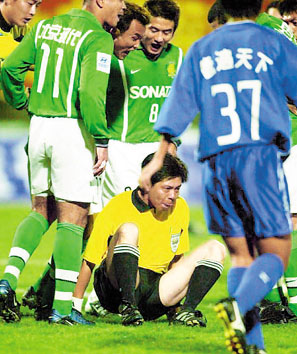 據(jù)新聞晨報(bào)報(bào)道,這個(gè)判罰激怒了北京隊(duì)員,外援雷吉納爾多沖向楊志強(qiáng),一把推搡之下瘦弱的裁判被摔倒在地。這一暴力舉動(dòng)迅速激化了場(chǎng)上局勢(shì),北京隊(duì)數(shù)名隊(duì)員沖了過來,圍住楊志強(qiáng),國(guó)安俱樂部工作人員也沖入場(chǎng)內(nèi)指責(zé)裁判。兩個(gè)邊裁也來到楊志強(qiáng)附近,擔(dān)當(dāng)起保衛(wèi)同盟者的職責(zé)。賽區(qū)監(jiān)督眼見形勢(shì)不妙,指揮數(shù)十名警察涌入場(chǎng)內(nèi)維持秩序。那個(gè)時(shí)候的鞍山賽場(chǎng)已亂成了一團(tuán)粥,比賽也因此延時(shí)5分鐘。