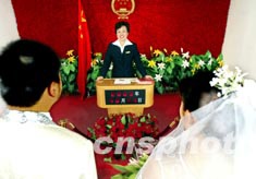 十月一日一早短短兩個(gè)小時(shí),北京市東城區(qū)婚姻登記處服務(wù)人員為近五十對(duì)新人舉行簡(jiǎn)短的頒證儀式。新婚姻登記條例于當(dāng)日正式實(shí)施,從此所有新人都將享受頒證儀式。中新社記者:鄭萍萍