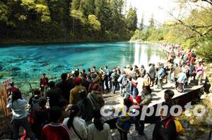 中國(guó)內(nèi)地“十一”黃金周開(kāi)始,世界自然遺產(chǎn)、著名風(fēng)景區(qū)九寨溝迎來(lái)大批觀光客,風(fēng)景秀美的五彩池被游客團(tuán)團(tuán)包圍。中新社記者:毛建軍