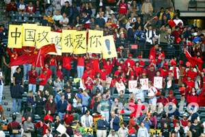 北京時(shí)間10月3日,在2003女足世界杯四分之一決賽中,中國女足0比1不敵加拿大隊(duì),抱憾告別本屆世界杯。圖為在波特蘭的中國留學(xué)生和華人華僑組成的啦啦隊(duì)打出橫幅為中國隊(duì)加油。作者:劉占坤