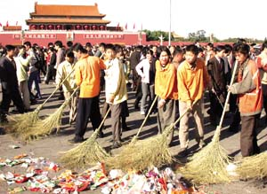 中新網(wǎng)10月4日電 據(jù)《京華時報》報道,由于游人“文明就差那么一點(diǎn)”,北京天安門廣場每天上10噸的垃圾讓環(huán)衛(wèi)部門有些不堪重負(fù)。