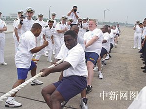 23日,中美海軍首先進(jìn)行了拔河友誼比賽。拔河比賽應(yīng)該說(shuō)是中國(guó)海軍水兵的強(qiáng)項(xiàng),在97年南海艦隊(duì)對(duì)美洲四國(guó)五港的訪(fǎng)問(wèn)中,中國(guó)海軍水兵拔河隊(duì)一路上攻城拔寨、未嘗敗績(jī)。但這次美國(guó)水兵拔河隊(duì)是有備而來(lái),且來(lái)者不善。15名隊(duì)員個(gè)個(gè)膀大腰圓、粗壯結(jié)實(shí),比如,其中一名黑人隊(duì)員桑塔納(SANTANA),此人身高199CM,體重250斤,來(lái)自美國(guó)亞特蘭大,是艦上的武器部門(mén)人員。中方隊(duì)員與對(duì)手相比在塊頭上明顯吃了虧,處于劣勢(shì)。比賽開(kāi)始前,美方隊(duì)員圍在一起,大聲鼓勁。比賽開(kāi)始后,中方水兵拔河隊(duì)奮力與對(duì)手展開(kāi)拉鋸戰(zhàn),雖拼盡全力,無(wú)奈實(shí)力稍遜一籌,最后不無(wú)遺憾地輸?shù)舯荣悾绹?guó)水兵也算報(bào)了上次比賽的一箭之仇。