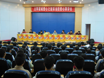 “太陽星城愛心之旅”采訪團在合肥工業(yè)大學的演講現(xiàn)場。(華夏時報圖 大漠攝)