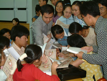 演講結(jié)束后,采訪團向合工大贈送了來自民間的思悟錄——〈牽手愛心〉,大學生們將“愛心之旅”成員周永琴、趙玉芝、宋體金、李繁民團團圍住,請他們簽字留念。(華夏時報圖 大漠攝)