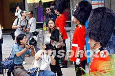 在國慶黃金周之際來香港 “自由行”的內(nèi)地游客,10月6日在中環(huán)鬧市巧遇國泰航空推廣活動,紛紛把握機會與英國衛(wèi)兵合影,顯得興高采烈。作者:統(tǒng)計員