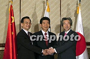 中國(guó)國(guó)務(wù)院總理溫家寶、日本首相小泉純一郎以及韓國(guó)總統(tǒng)盧武鉉十月七日在巴厘島舉行了中日韓領(lǐng)導(dǎo)人第五次會(huì)晤。會(huì)晤結(jié)束后,三國(guó)領(lǐng)導(dǎo)人簽署了《中日韓推進(jìn)三邊合作聯(lián)合宣言》。中新社記者:齊彬