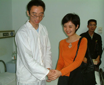 9月26日,鳳凰衛(wèi)視知名女主播、“華夏愛心團(tuán)愛心專員”許戈輝,手捧鮮花,來到空總血液科病房慰問身患MDS骨髓增生異常綜合癥的貧困大學(xué)生干海濤,并現(xiàn)場(chǎng)捐贈(zèng)一萬元。北京太陽宮房地產(chǎn)有限公司總經(jīng)理韓國建也代表華夏愛心團(tuán)捐助了現(xiàn)款,并邀請(qǐng)海濤在“牽手愛心墻”的采集印上按下了自己的手印。