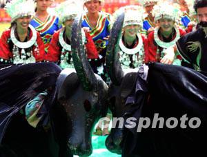貴州省黔東南自治州苗族青年節(jié)日期間為游客表演斗牛歌舞,展示當?shù)孛褡鍌鹘y(tǒng)文化,豐富旅游內(nèi)容。中新社記者:宋吉河