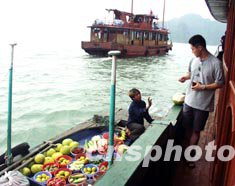 下龍灣離越南首都河內(nèi)165公里,有成千座石島,島上有許多山洞,可以互相貫穿,并呈現(xiàn)不同的形狀,是世界奇觀之一,盡管氣候炎熱,仍有游客接踵而至。圖為在下龍灣游覽的中國(guó)游客向船家購(gòu)買新鮮水果。作者:陶社蘭
