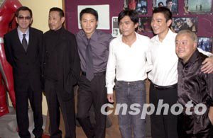 港產(chǎn)電影《無(wú)間道Ⅲ終極無(wú)間》10月9日在香港特別安排傳媒采訪探班,曾志偉、劉德華、梁朝偉、黎明、陳道明、黃秋生(右起)六大影帝聚首一堂。中新社記者:鄧慶樂(lè)