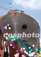 中新社上海十月九日電(記者褚婷婷)為適應(yīng)運輸輕軌列車等大型設(shè)備的需要,載重三萬噸的多用途重吊貨輪——“中波明月”號,今天中午在上海船廠二號船臺下水。據(jù)悉,這種貨輪是當今世界件貨航運市場上最先進、規(guī)模最大的運輸工具,它的建成及不久后的投入營運,將有力提升中國在世界雜貨運輸航線上的競爭力。