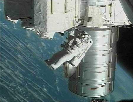 2002年2月20日,國(guó)際空間站第四長(zhǎng)期考察組的美國(guó)宇航員伯施對(duì)高壓氮氧艙進(jìn)行了檢查。國(guó)際空間站的宇航員首次在沒(méi)有航天飛機(jī)對(duì)接的情況下實(shí)施太空行走。新華社圖