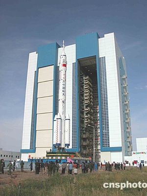 “神舟”五號(hào)緩緩離開總裝測(cè)試廠房 向發(fā)射塔架進(jìn)發(fā)