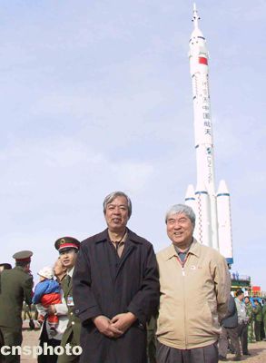“神舟”五號載人飛船總設(shè)計(jì)師戚發(fā)軔(右)和“神箭”——長征二號F運(yùn)載火箭總設(shè)計(jì)師劉竹生在箭船塔組合體垂直轉(zhuǎn)運(yùn)現(xiàn)場合影留念。中新社記者孫自法攝