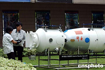 圖:香港太空館在廣場設(shè)置神舟五號模型