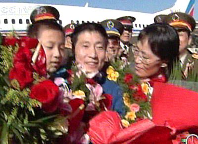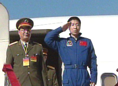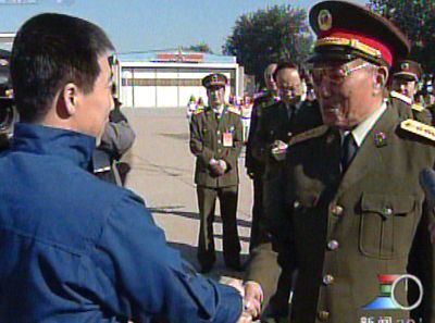 中新社北京十月十六日電 十六日上午,剛剛隨“神舟”五號(hào)飛船安全返回地面的中國(guó)首位航天員楊利偉,乘專機(jī)從內(nèi)蒙古著陸場(chǎng)飛抵北京。中共中央政治局委員、中央軍委副主席、國(guó)務(wù)委員兼國(guó)防部長(zhǎng)曹剛川在中央軍委委員、總裝備部部長(zhǎng)、載人航天工程總指揮李繼耐和總裝備部政委遲萬春的陪同下到機(jī)場(chǎng)迎接。
