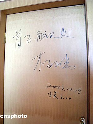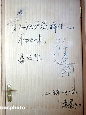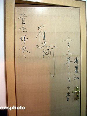 二00三年十月十五日凌晨,中國(guó)飛天第一人楊利偉及首飛梯隊(duì)航天員于“神舟”五號(hào)載人飛船發(fā)射前,在酒泉衛(wèi)星發(fā)射中心航天員公寓“問(wèn)天閣”的住房房門上簽名留念。中新社記者 孫自法 攝影報(bào)道