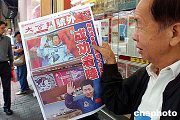 中新社香港十月十六日電中國首次載人航天的“神舟”五號今晨成功著陸后,香港《文匯報》、《大公報》以第一時間印出號外,市民紛紛搶閱。今天出版的香港主要報章,除圖文并茂地大幅報道“神舟”五號的相關消息外,還分別發(fā)表社評,祝賀這一壯舉。