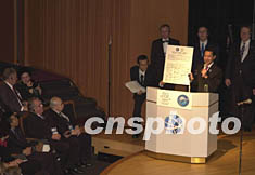 17日晚在日本東京閉幕的第十八屆世界宇航員會議發(fā)表了一項由與會六十六名宇航員署名的共同宣言,呼吁世界各國以各自的成熟文化為今后的宇宙探險做出貢獻。圖為本屆大會主席之一的日本資深宇航員毛利衛(wèi)在閉幕式上展示這份共同宣言。作者:王健