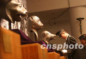 十月十八日,圓明園的銅豬首、銅牛首、銅猴首和銅虎首四件國寶在保安人員護衛(wèi)下回到了闊別143年的故里,在圓明園與廣大觀眾見面。曾被英法聯(lián)軍掠走的這四件國寶是中國保利集團及愛國人士用重金從境外購回的。中新社記者:史利