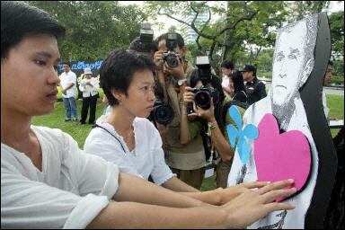 在本周五泰國農(nóng)民的游行隊伍中,一位老者將布什的照片塞入一個鐵罐后封了口,并將鐵罐投入泰國北部的一條河中。據(jù)稱,這是古代高棉地區(qū)的一種下降頭的方法。