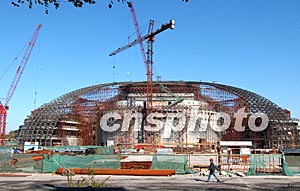 金秋十月,號(hào)稱“中國(guó)第一藝術(shù)殿堂”的國(guó)家大劇院工程建設(shè)進(jìn)展順利,跨度達(dá)二百一十二米的巨大穹形屋頂鋼結(jié)構(gòu)骨架已開(kāi)始安裝,國(guó)家大劇院蛋形輪廓初步顯現(xiàn)。中新社記者:張煒