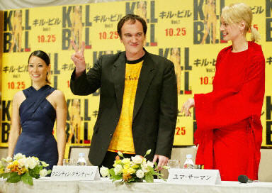 10月19日,美國導演昆汀·塔倫蒂諾(中)、好萊塢著名影星烏瑪·瑟曼(右)和劉玉玲在日本東京出席最新動作片《殺死比爾》的新聞發(fā)布會。該片由塔倫蒂諾執(zhí)導,瑟曼、劉玉玲主演,將于10月25日在日本公映。