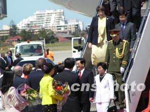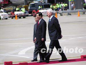 中國國家主席胡錦濤和夫人22日上午10時許抵達悉尼國際機場,對澳大利亞進行國事訪問,受到澳聯(lián)邦總督杰弗里和總理霍華德等熱烈歡迎。中新社記者 劉雨生 攝
