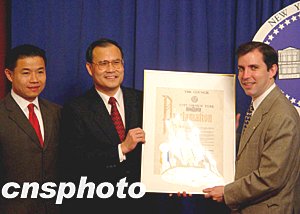 紐約市議會(huì)二十二日向中國(guó)駐紐約總領(lǐng)館頒發(fā)賀狀,祝賀中國(guó)首次發(fā)射載人航天飛船“神舟五號(hào)”成功。圖為議長(zhǎng)米勒(右)向中國(guó)駐紐約總領(lǐng)事劉碧偉(中)頒發(fā)賀狀,左為提出頒發(fā)賀狀動(dòng)議的紐約市議會(huì)第一位華裔議員劉醇逸。作者:李杭