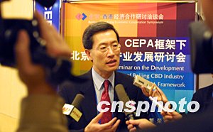 CEPA框架下北京CBD產(chǎn)業(yè)發(fā)展研討會二十四日在北京飯店召開,香港貿(mào)易發(fā)展局基建業(yè)發(fā)展咨詢委員會主席劉炳章在會后表示:北京CBD的發(fā)展應吸取香港中環(huán)商業(yè)區(qū)的經(jīng)驗教訓,作好策略性規(guī)劃,協(xié)調(diào)商業(yè)用地與公共空間的均衡發(fā)展。中新社記者:廖文靜