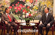 國務(wù)院僑辦副主任趙陽(圖右)24日在重慶會見菲律賓著名華人實業(yè)家陳永栽,趙陽表示,陳永栽先生投資設(shè)立的新聯(lián)商業(yè)銀行重慶分行將對重慶乃至西部地區(qū)經(jīng)濟發(fā)展起積極作用。作者:鄒輝