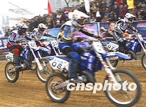 2003年“嘉陵杯”全國越野摩托車總決賽24日在重慶嘉陵賽車場(chǎng)拉開戰(zhàn)幕,來自全國21支隊(duì)伍120多名運(yùn)動(dòng)員參賽,為爭(zhēng)取全年的總排名爭(zhēng)奪異常激烈。中新社記者:趙振清