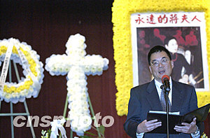 美西時(shí)間十月二十六日晚,美國(guó)加州圣尼維爾市僑界舉辦追悼會(huì),悼念二十三日晚在紐約去世的蔣介石遺孀宋美齡。圖為宋美齡弟弟宋子安的二兒子宋仲虎在追悼會(huì)上發(fā)言,悼念姑媽。作者:陳鋼