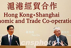 香港特區(qū)行政長(zhǎng)官董建華和上海市長(zhǎng)韓正,10月27日在香港政府總部會(huì)見傳媒,董建華表示,與上海市長(zhǎng)韓正討論滬港經(jīng)貿(mào)合作,雙方同意在八個(gè)領(lǐng)域加強(qiáng)合作。中新社記者:洪少葵