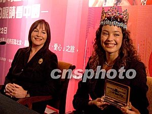 “美麗的眼睛看中國(guó)”第五十三屆世界小姐總決賽城市巡游活動(dòng),二十九日在北京舉行新聞發(fā)布會(huì),第五十二屆世界小姐冠軍阿金(右)與世界小姐機(jī)構(gòu)主席莫莉夫人展示即將于十一月一日在三亞拍賣的金票。即將拍賣的這張金票起派拍價(jià)格六千美元,正面鑲嵌著24K金票面,票面的背景是三亞市“美麗之冠”文化會(huì)展中心,并刻有“健康美麗和平愛(ài)心”及“第53屆世界小姐總決賽紀(jì)念金票”的字樣。中新社記者:任海霞