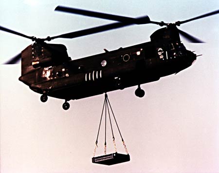 在越南戰(zhàn)爭(zhēng)中,CH-47A主要用于為陸軍部隊(duì)運(yùn)送兵員物資,特別是在為炮兵吊送火炮到不便進(jìn)入的復(fù)雜地帶,為前線輸送油料(一次外吊2個(gè)各500加化容量的軟油箱)和回收近降或受傷在外的直升機(jī)(一次可吊一加UH-1)方面獲得好評(píng)。在越南南方,當(dāng)以200千米/小時(shí)的速度全速低空飛行時(shí),基本不需要?jiǎng)e的飛機(jī)的護(hù)航。但渦輪式發(fā)動(dòng)機(jī)在高山、高溫季節(jié)中出力不足,影響了性能的正常發(fā)揮。曾有3架CH-47A被改為重火力空中護(hù)航機(jī),共裝備7.7毫米機(jī)槍7挺、20毫米機(jī)炮3門(mén)、40毫米擲彈筒一具和火箭發(fā)射巢1具,型號(hào)為ACH-47A。