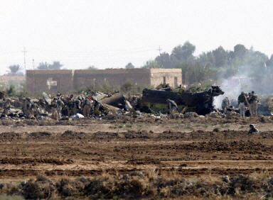 駐伊美軍發(fā)言人說,目前已證實2日在巴格達附近被擊落的美軍運輸直升機造成13人死亡,至少20人受傷。圖為墜落在費盧杰的美軍用直升機失事現場。
