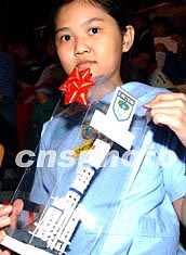 香港中、小學(xué)生與楊利偉及航天科學(xué)家11月3日在香港伊利莎白體育館舉行見(jiàn)面會(huì),一名小學(xué)生向楊利偉送禮品。 中新社記者:錢(qián)興強(qiáng)