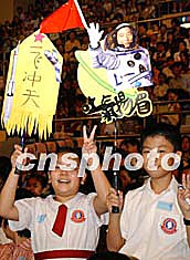 11月3日在香港伊利莎白體育館舉行的香港中、小學(xué)生與楊利偉及航天科學(xué)家見(jiàn)面會(huì)上,學(xué)生興高采烈舉著楊利偉像歡呼。中新社記者:錢(qián)興強(qiáng)