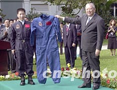11月5日,香港特區(qū)政府在禮賓府舉行中國(guó)首次載人航天飛行代表團(tuán)歡送儀式,中國(guó)首位升空宇航員楊利偉向特首董建華致送他受訓(xùn)時(shí)所穿著的制服。中新社記者:鄧慶樂(lè)