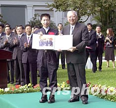 11月5日,香港特區(qū)政府為中國(guó)首次載人航天飛行代表團(tuán)舉行歡送儀式,特首董建華向楊利偉致送訪港時(shí)的相片。中新社記者:鄧慶樂(lè)